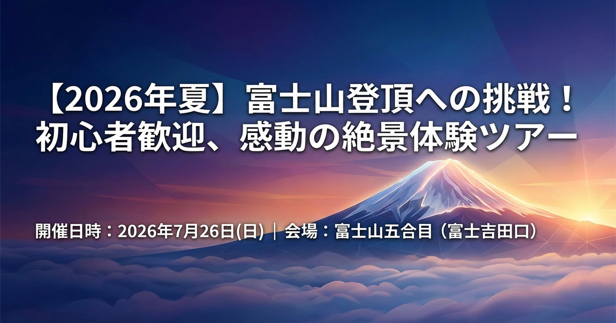 「いつかは富士山に登ってみたい!」そんな夢をお持ちではありませんか?本イベントは、初めて富士山に挑戦する方や、体力に自信がない方でも安心してご参加いただける、ガイド付きの富士山登頂ツアーです。経験豊富な登山ガイドが同行し、安全管理を徹底しながら、日本最高峰からの絶景と達成感へと皆様を導きます。